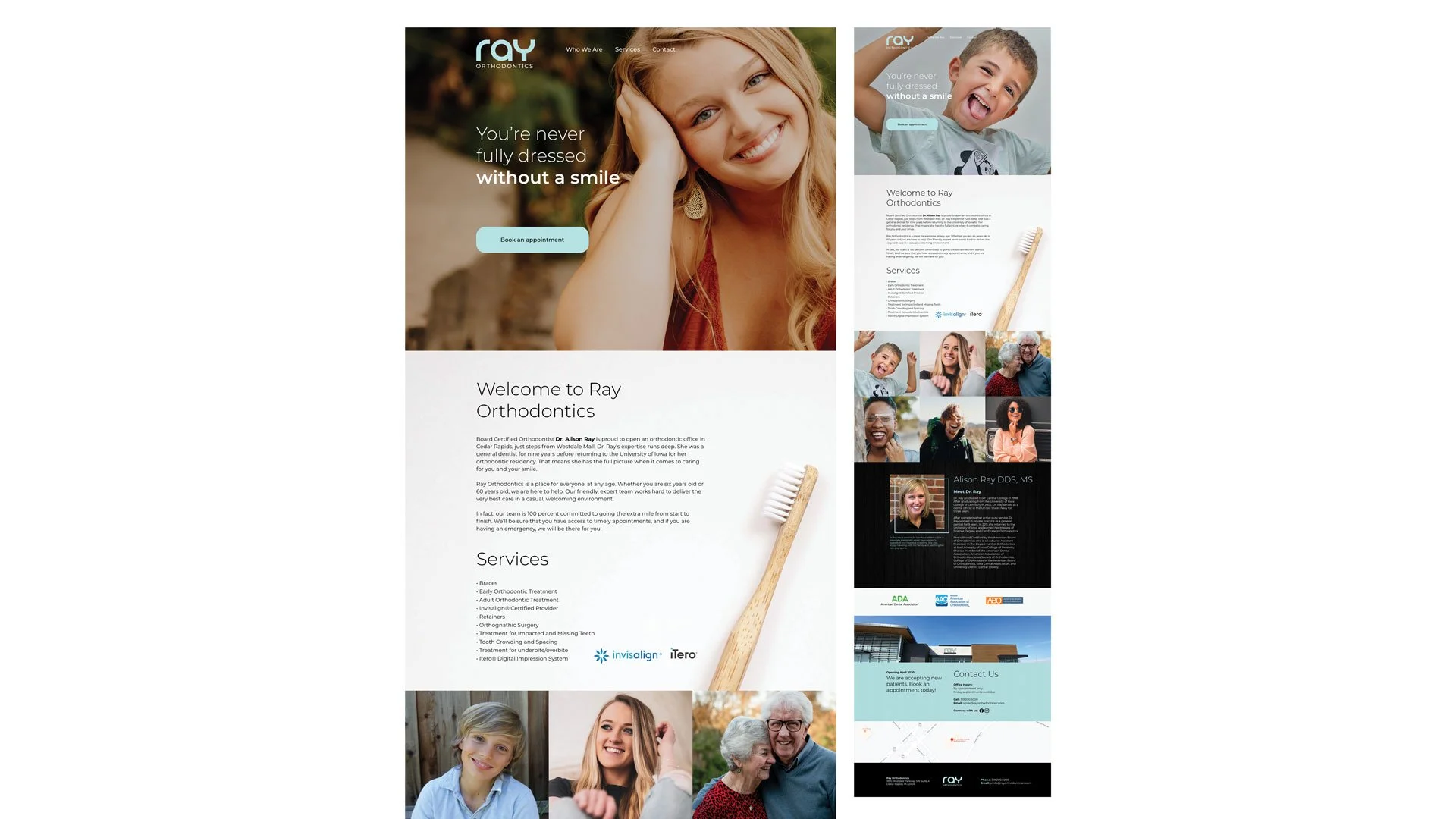 The visual identity extended across a responsive website, signage, and an in-office photoshoot, capturing the welcoming atmosphere of Ray Orthodontics' office location in Westdale Town Center, Cedar Rapids.